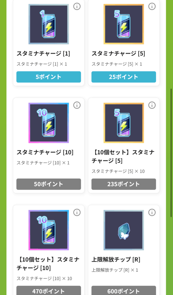 Coly Soreでも、貯めたポイントとスタミナドリンクを交換することができますが、ポイントは限界突破チップとも交換できるので、ドリンクにしてしまうのは少しもったいないかもしれません。
